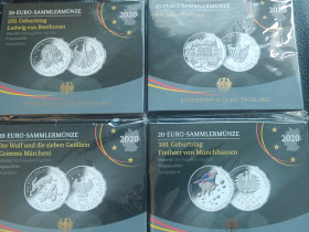 Hallo zusammen,ich biete hier 19 verschiedene 20 € Silbermünzen in Spiegelglanz direkt von der Münze Deutschland.5 x 20175 x 20185 x 20194 x 2020Alle original in Blister und Folie ungeöffnet.Für 420 Euro packe ich alles in ein schickes Paket und versende es mit DHL.Gruß einfach goldig! ![]()