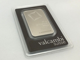 Ausgeliefert werden 50g Palladiumbarren als prägefrische Barren des schweizer Herstellers Valcambi (LPPM zertifiziert).
