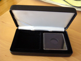 Vertiefung, Druckverschluß. Für Münzen oder Medaillen bis 45 mm (1oz Panda, Koala), ohne Kapsel: € 1,45zzgl. gewünschtem Versand (Brief, gepolstert mit Pappe verstärkt: je nach Größe €0,90 - 1,45 - 2,60 oder versichertem Hermes-Päckchen: 3,95 oder DHL-Paket: 5.-
