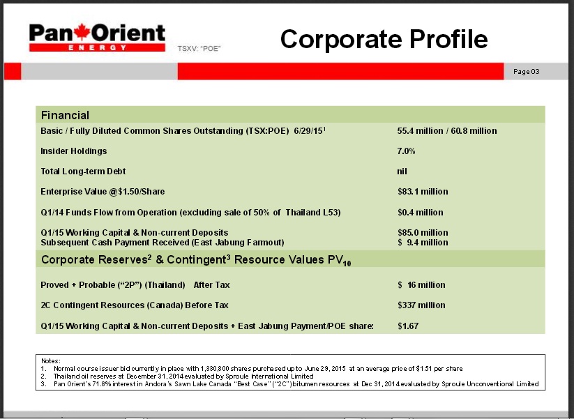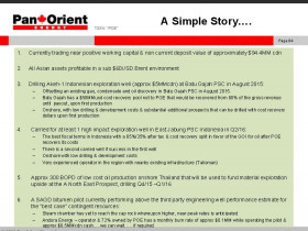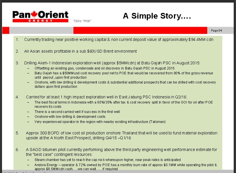 ZitatPan Orient Energy Corp. is a Canada junior gas and oil company. The company has a market cap of $48.14 million. The Firm is engaged in exploration and development of petroleum and natural gas. It has 1.58 P/E ratio. The Firm focuses on two primary areas which includes exploration and development in Asia, principally in Thailand and Indonesia, and heavy oilsands exploration in Northern Alberta.