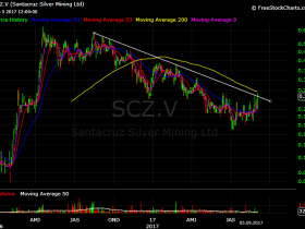 Kleiner Produzent in Mexiko. SCZ.V wird wohl mit einem Hebel auf den Silberpreis mitgeschwemmt. Gestern mit einem sehr guten Tag.Chart 1 daily: Nun müsste aber die Bestätigung kommen und die Trendlinie in den nächsten 2 bis 3 Tagen definitiv geknackt werden. Die Anordnung der MA's ist gut, allerdings durch den gestrigen Monstermove hat man sich bereits arg entfernt kurzfristig. Optimal wäre 1 bis 2 Tage seitwärts/kleine Konsolidierung, damit MA's aufholen können, und dann mit Schmackes nach oben weg.