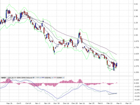 Noch ist der Abwärtstrend nicht vorbei. Der 9 MA, der seit Januar der Wegbegleiter nach unten war, wurde heute zwar knapp überwunden, aber noch nicht signifikant. Der 20 MA sollte auch noch genommen werden, bis man von dieser Seite eine Durchbrechung des Musters erkennen kann.
