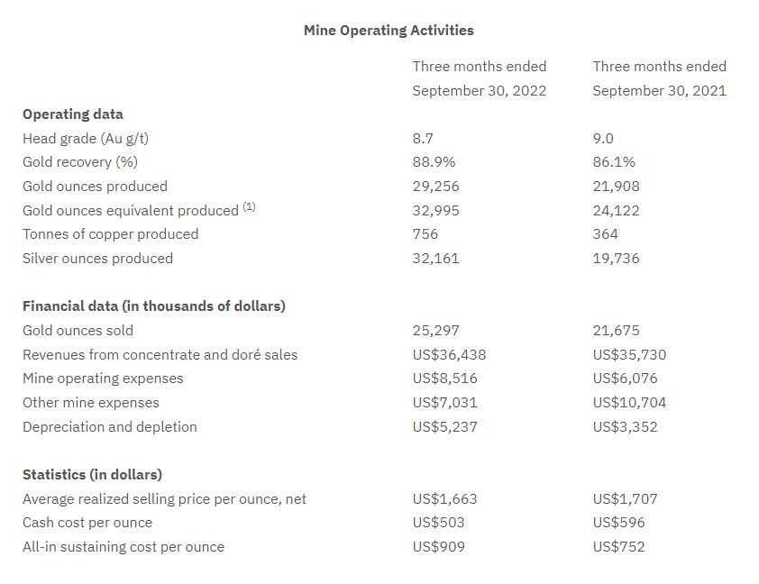 • Record mine throughput with 114,471 tonnes mill feed mined during the quarter or 1,258 tpd, an increase of 59% from Q2 2021.