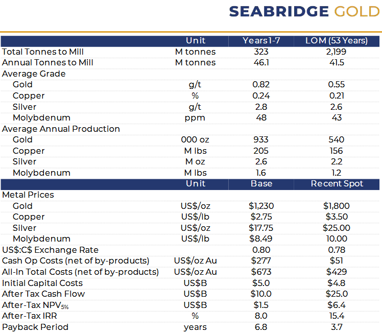 Was Tudor wahrscheinlich erwartet, können wir anhand der PFS von Seabridge aus dem Jahr 2016 erahnen. Bei einer Initial Capex von 4.8 Mrd. $ lockt dort bei einem Goldpreis von 1'800 $ eine IRR von lediglich 15.4 % und ein NPV von 6.4 Mrd. Der Goldpreis muss einiges höher stehen, damit dort ein Bagger und ein Sprengmeister mit Dynamit auffahren. Da gibt es in der Zwischenzeit sicher lukrativere Invests.