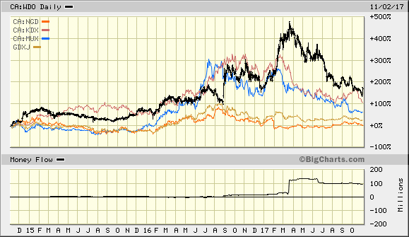 Der Kursabfall von WDO ist schon heftig, wenn man nur das kurze Bild sieht. Bei näherer Betrachtung ist es soliden Peer Brüdern gauz ähnlich ergangen, von exzellenten Mineueren geführt... MUX mit McEwen und v.a Klondex mit Huet zeugen davon....