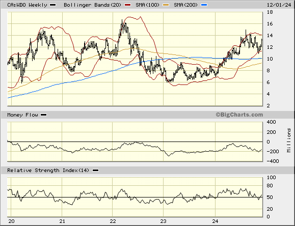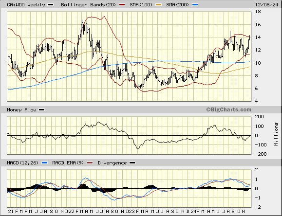WDO ist zwar kein Himmelsstürmer wie z.B.Agnico oder Kinross, aber inzwischen wieder grundsolide und etwa mit dem GDX, der SpitzenRoyalty Wheaton sowie dem Goldkurs performend.