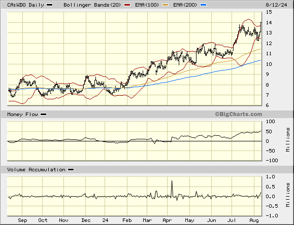 WDO ist zwar kein Himmelsstürmer wie z.B.Agnico oder Kinross, aber inzwischen wieder grundsolide und etwa mit dem GDX, der SpitzenRoyalty Wheaton sowie dem Goldkurs performend.