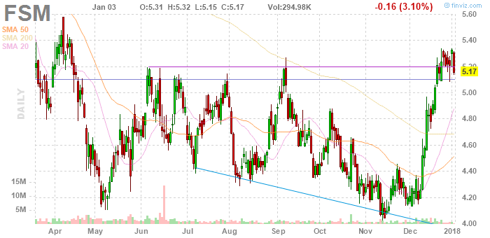 Einfach etwas abwarten, so tief wie 2016 wird sie kaum fallen. Auch der Chart von DrK zeigt, daß FSM / FSV momentan überkauft ist. Der etwas ergänzte Chart zeigt einige Pivot Points. Noch hält eine starke Unterstüzung im Bereich 5 $ ..