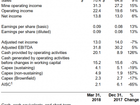 • Silver production of 2,401,458 ounces; 18 percent increase over Q1 2017