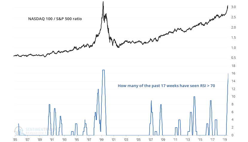 Investors' & traders' love affair with tech continues as the NASDAQ 100 outperforms16 of the past 17 weeks have seen the NASDAQ 100 / S&P 500 ratio's RSI exceed 70!The only other time tech persistently outperformed this much was at the height of the *dot-com bubble* in 2000