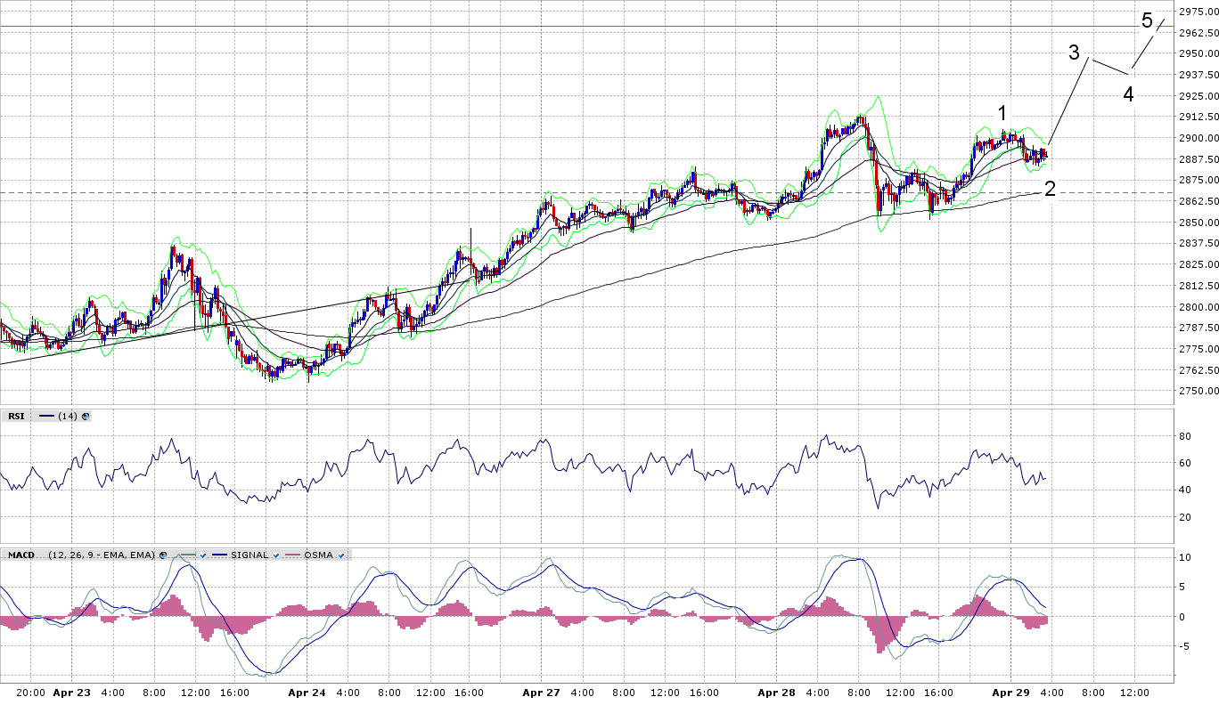 aktuell Beginn der Unterwelle 3? Heute noch stärker Anstieg, dann kurze Korrektur und divergierendes finales Top?