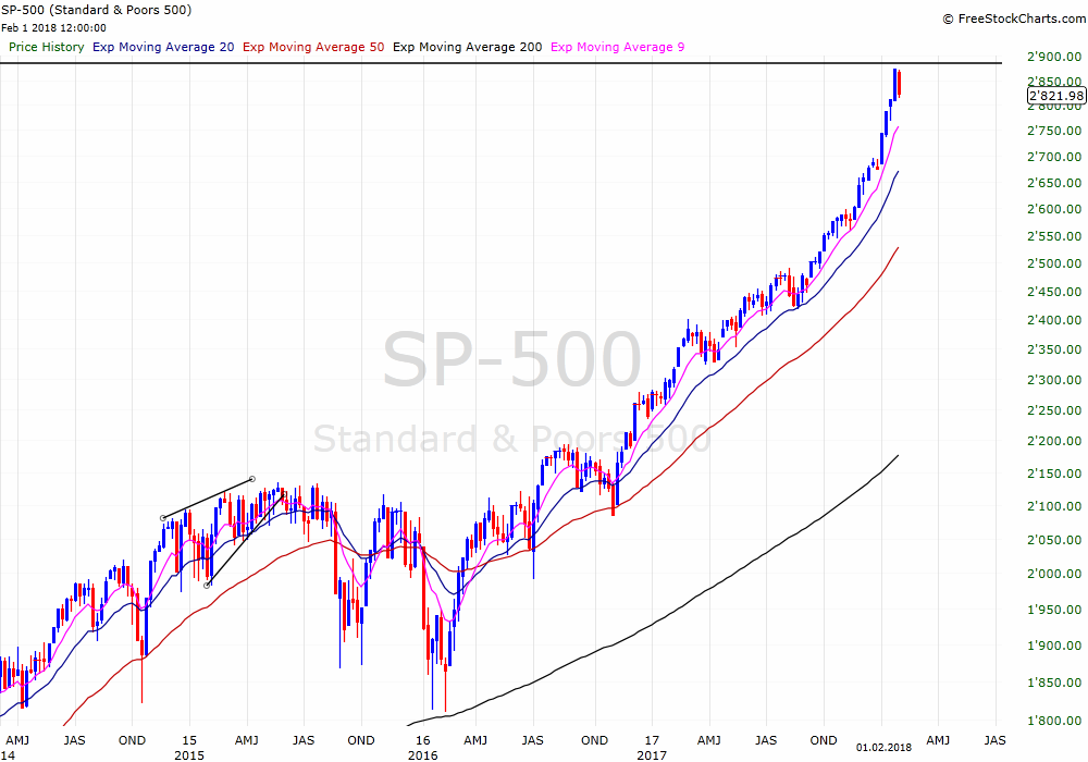 Chart SPX weekly: Die Zeit scheint nun tatsächlich reif für eine grössere Korrektur bis zum 20 oder 50 MA, siehe Chart. 50 MA wäre rund 10 %....
