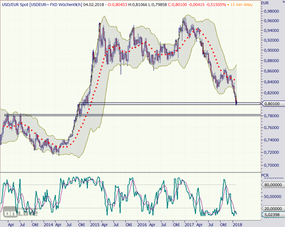 Ergänzung USD/EUR Wochenchart mit zwei Widerstandszonen.