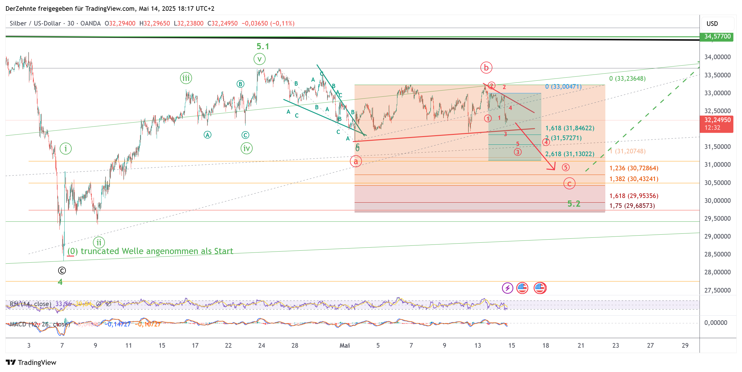 Update zu Silber - aus der bullischen Hoffnung wird ein kurzfristig Bärisches Setup - Abverkauf mit Gold auf 31,2 bis 29,9 USD im Tief - Danach Anstieg in einer Welle 3-4-5 über Monate hinweg dann Richtung 50 Dollar.