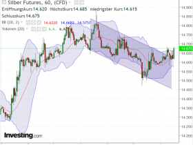 Bei Silber bleibe ich an der Seitenlinie und rechne damit, dass nochmal zumindest die 14,30-35 getestet werden. Dort kann man m.E. einen ersten Kauf wagen aber muss m.E. nochmal mit 14.20 und ggf. 14,00 rechnen.