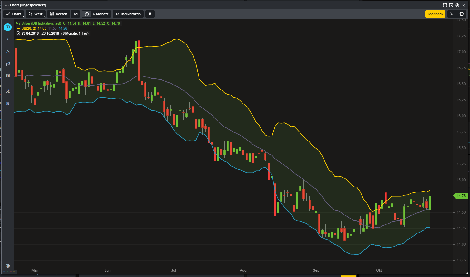 Würde aufpassen mit deinem Call und glatt stellen. Erst wieder am unteren Bollinger Band (14,25 USD, die blaue Linie) kaufen, ggf. in dem Euroäquivalent.