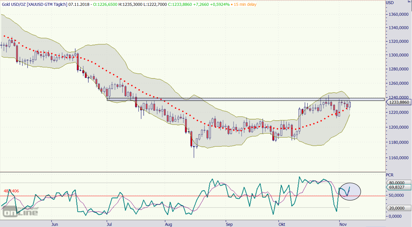 Der Momentumindikator dreht wieder nach oben. Die kritische Grenze von 50 hat anders als bei den letzten Abwärtsbewegungen gehalten.