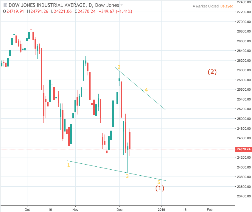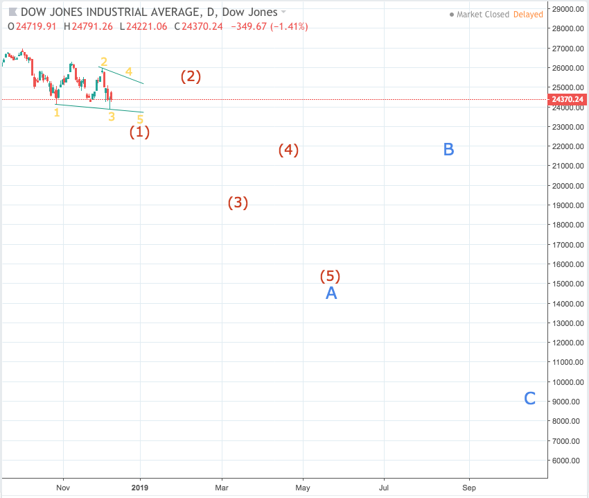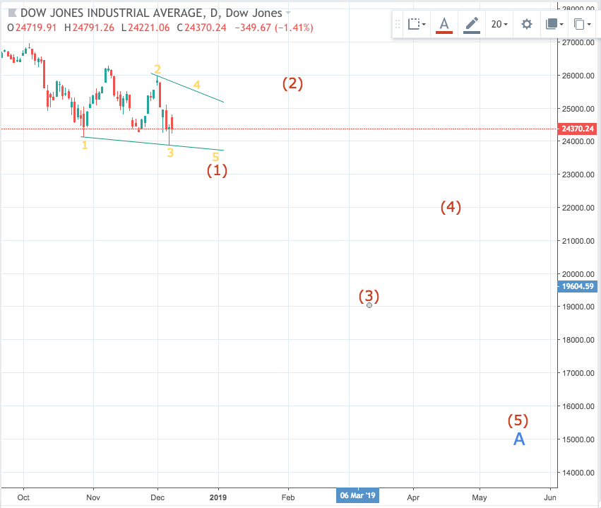In dem vorliegenden Kursgeschehen beim Dow Jones seit dem 03. Oktober 2018 könnte sich ein eben solches LDT in Welle 1 einer großen Abwärtsbewegung bilden. (siehe Charts)