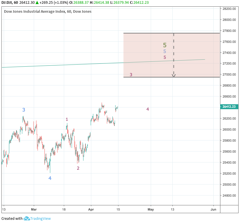 Die Trendlinie verläuft im Mai 2019 bei ca. 27.250 Punkten. Das wären exakt die 100 % von Welle 1 für die abschließende Unterwelle 5 (violett) der Unterwelle 5 (hellblau) der übergeordneten Welle 5 (grün)...