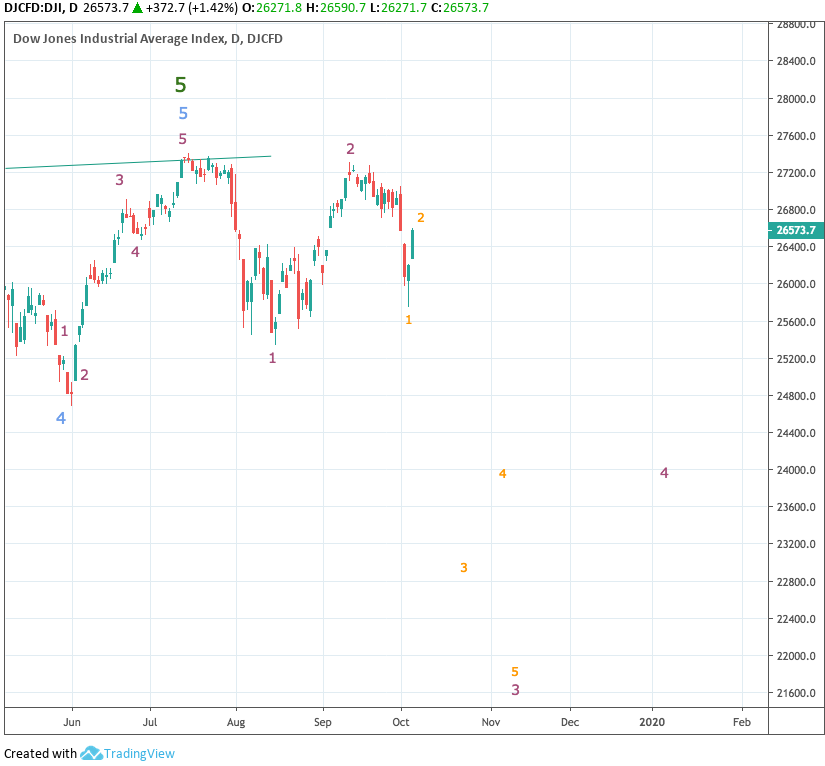 Es könnte jetzt nochmals in den Bereich 26.940 - 26.960 Punkte gehen (3.3.3.2) und danach stark abwärts (ca. 26.535 Punkte - 3.3.3.3) und ca. 26.300 Punkte als Endziel der 3.3.3.