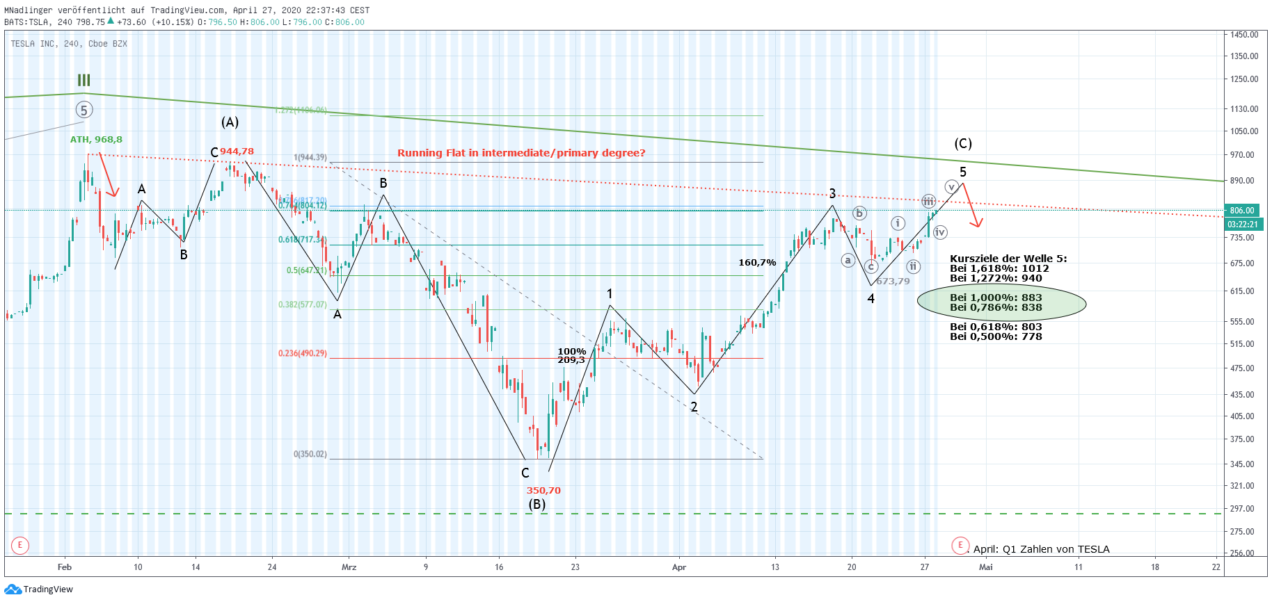 Jetzt kommt dann theoretisch die Finale Welle (v) der 5 - was Zeitlich zu einem Anstieg morgen bzw. im Anschluss an die Q1 Ergebnisse passen würde. Damit sollte es aber auch wieder gewesen sein - dann gehts bergab - nur weiß man nicht wie weit es hoch geht die nächsten Tage.
