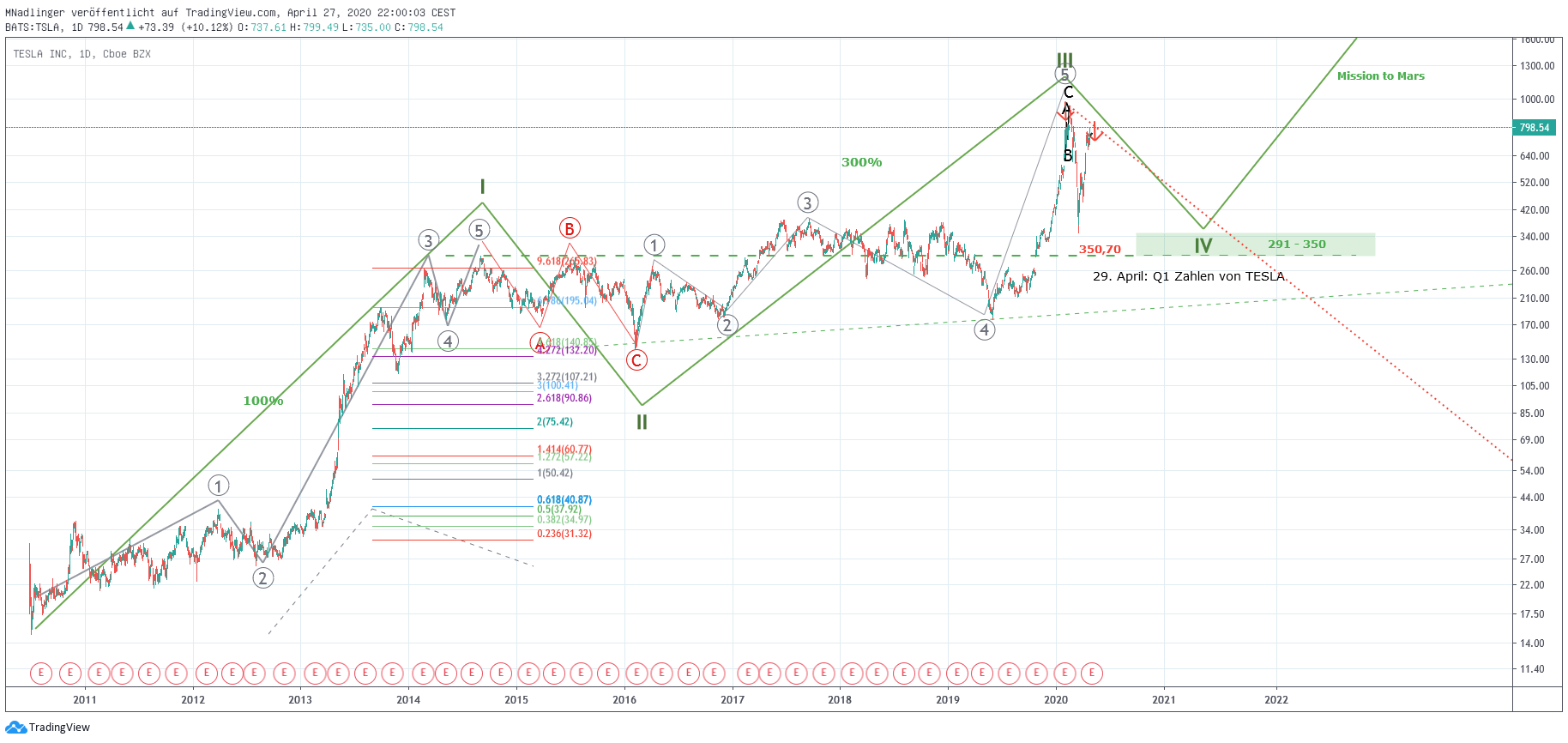 (Anm: Vorher bin ich von einer ABC-Korrektur von 350 nach 780$ ausgegangen, wo ich aktuell eine 3-teilige Welle B sah, was sich jetzt negiert hat. Lektion: Geduld ist gefragt!)