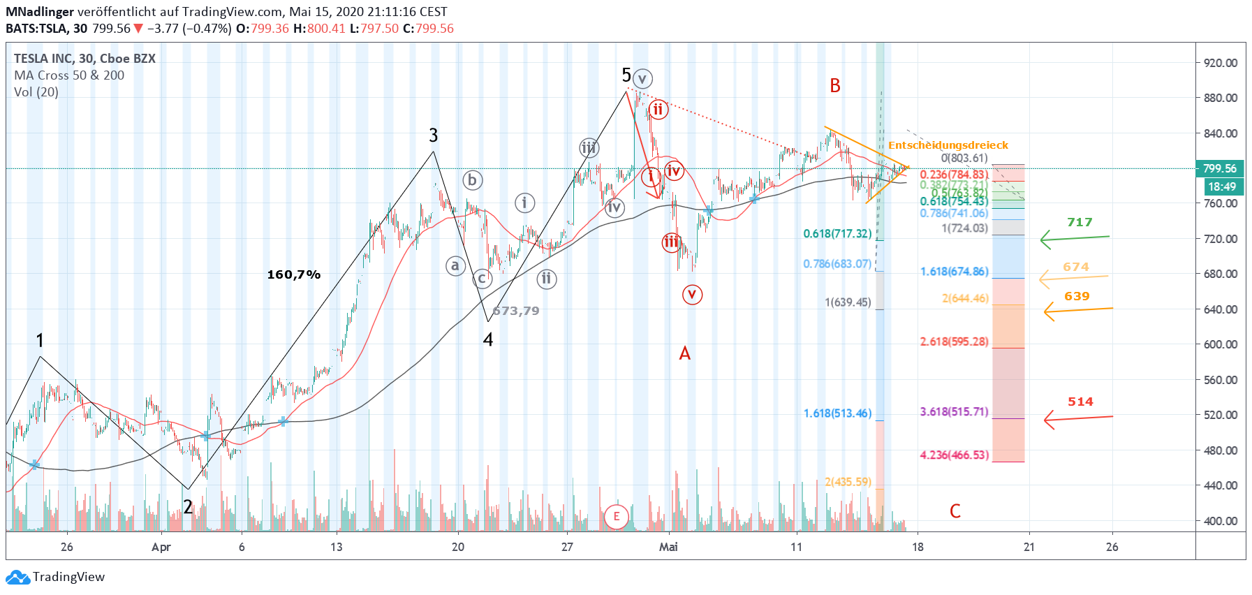 ja es bewegt sich einiges momentan, wäre aber im Nachhinein froh nicht so stark short gewesen zu sein bei TESLA, und mehr Minen gekauft zu haben. Unten ein Chartupdate inkl. Zielmarken mit der Annahme einer sich vollenendenden Korrektur der Aufwärtsbewegung der letzten Wochen. Ich vermute, dass sich heute nachbörslich die Richtung weisen wird. Anschließend wäre ein Anstieg auf neue Hochs möglich - TESLA und sein Eigenleben: