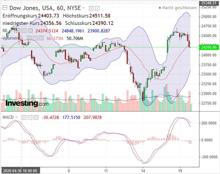 Notenbank hat den Banken erklärt, sie sollen für schlechte Zeiten das Geld zusammenhalten = Dividenden kürzen. Probleme könnte Wells Fargo bekommen, die 220% des Gewinns ausschütten.Ich erwarte nach positiv interpretierten News zum PMI ein "sell on god news" vor dem verlängerten Wochenende, um Gewinne zu sichern. Montag ist in den USA Feiertag (Memorialday).