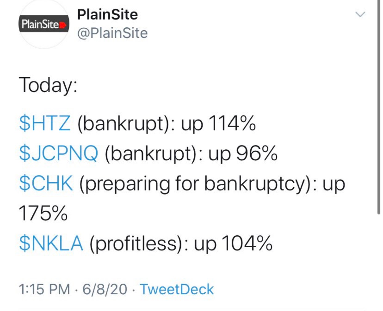 Noch nie hatten wir so ein mieses wirtschaftliches Umfeld, und soviel künstlich erzeugte Liquidität am Markt. Wenn man selbst für insolvente Unternehmen wie Lufthansa ( https://www.airliners.de/lufth…olvenz-staatshilfen/55660 ) den Normalpreis ( wie 3 Monate vorher) bezahlt steckt soviel Irrationalität drin das nur ein Funke genügt um die Blase platzen zu lassen. Alle Profis raten ab Unternehmen zu kaufen in die der Staat hineinregiert, aber genau die scheinen bei den Neuanlegern sehr beliebt zu sein.