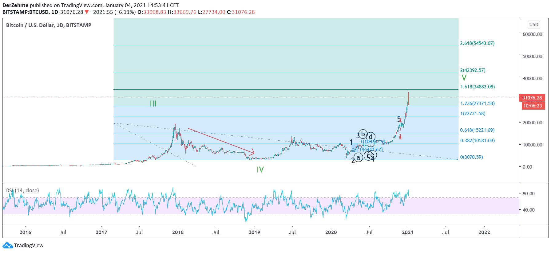 Bitcoin stoppe bei interessanter Chartmarke, 1.618 Expansion von 0.06 - 19660 USD angelegt an den Start der letzten Welle. Es könnte alles mögliche passieren, aber auch das Ende einer großen Welle 5 gewesen sein, welche 161% von I-III war! Lehrbuchmäßiges Maximum für Welle 5, es könnte aber in diesem Extremfall auch noch bis 55.000 USD gehen meiner Meinung nach. Jedoch ist Bitcoin schon wieder extrem in den Schlagzeilen was eine Wende ebenfalls andeutet. "Experten sehen kein Ende der Ralley bei Bitcoin" usw. Bla bla bla (Nur zur Info, keine Hanldungsempfehlung.)