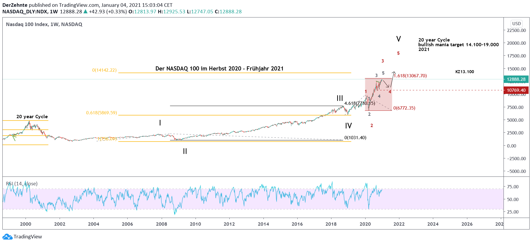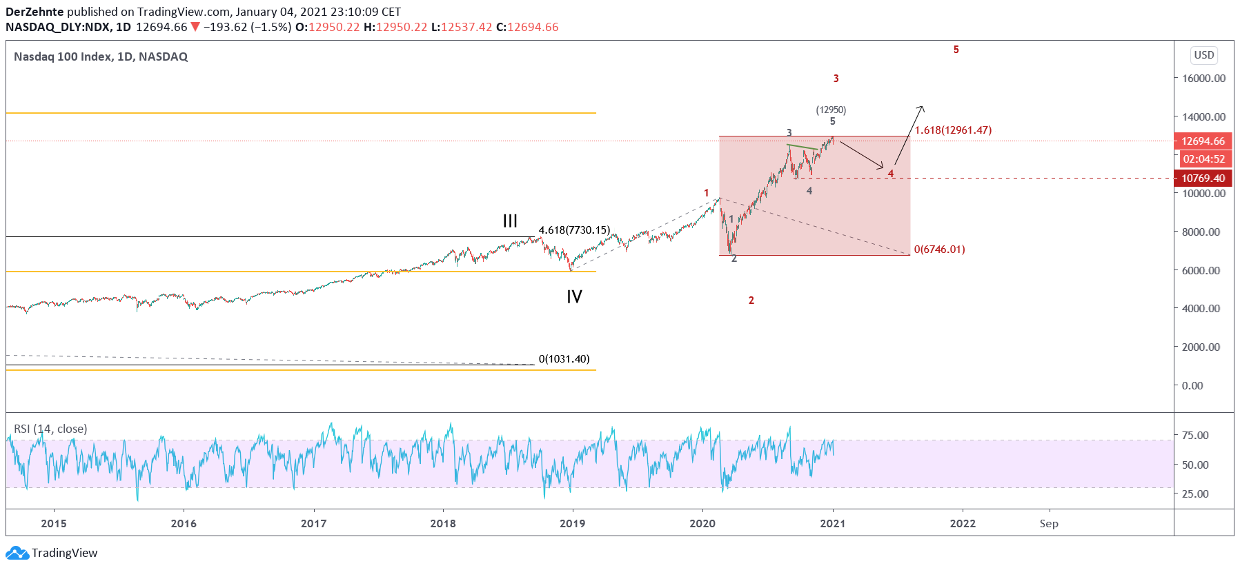 Nachtrag zum NASDAQ100 - habe Messpunkte der Wellen noch etwas exakter eingetragen und es zeigt sich nun eine Abweichung von 10 Punkten, beim Top einer vermuteten Intermediate Welle 3 am heutigen Tag. Ziemlich exakt eine 161,8% Expansion der 3 von der angenommen 1. Somit zeigt sich 12950 wohl als Charttechnischer Wendepunkt. Somit könnten noch ein paar Minustage bei den Techaktien folgen. Sehr verlockend zum shorten, aber keine Empfehlung.