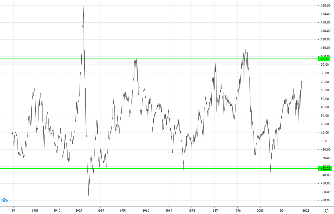1956 war überhaupt kein Crash. Ist man da ausgestiegen (48 Pkt.) und 1974 eingestiegen (63 Pkt.), so hat man nach 19 Jahren (!) nur 30% verpasst - zwischendurch aber 150%.