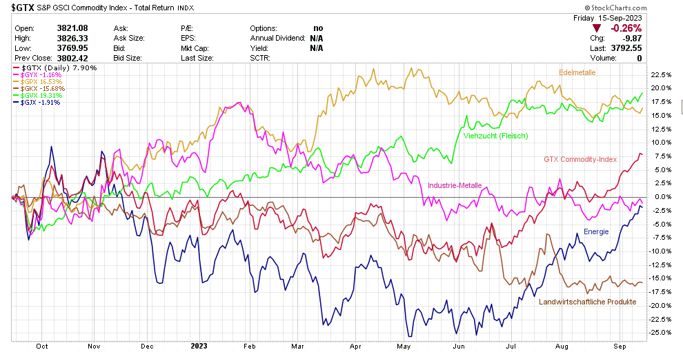 Guggsch Du da…der Commodity-Index seit Juni in stabilem Aufwärtstrend. (An)geführt vom Energiesektor.