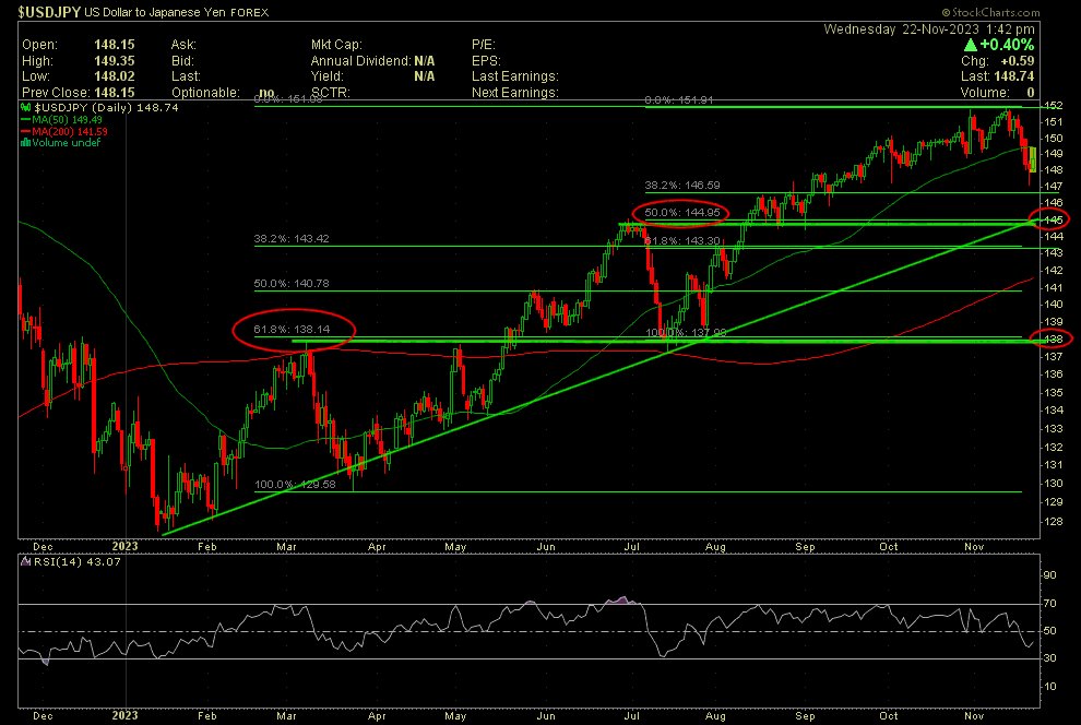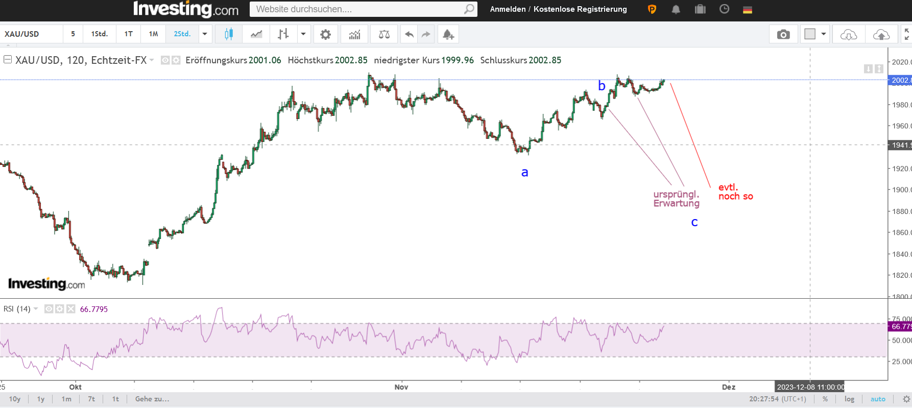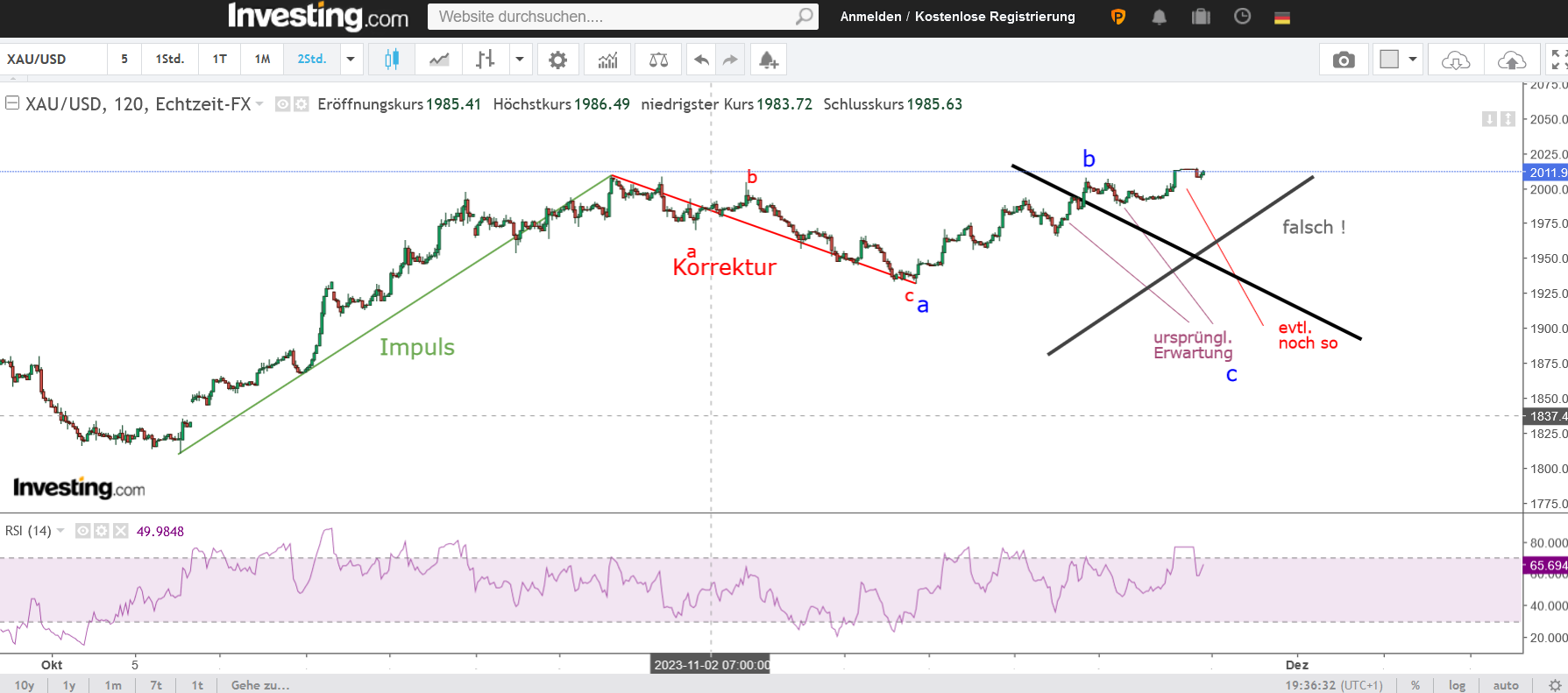 Vermutlich verspätet sich die Korrekturfortsetzung in Richtung 1900 um ein paar Tage. Fundamentale Erklärung könnte sein, daß der Israel-Krieg durch die Freilassungen der Geiseln erst ab Montag eine Entspannung im Gold bringt, hier kann man den Goldpreis unauffälliger hinabbegleiten, als es diese Woche der Fall gewesen wäre.