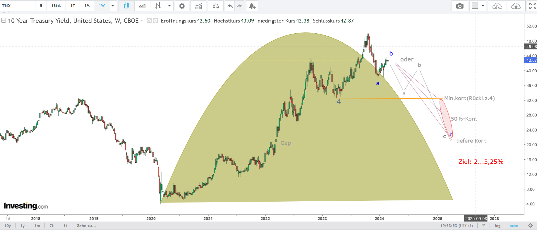 Solange sollten die Zinsen fallen (ein bedeutender Zinszyklus der 10-jährigen macht dort ein Tief !!!) und auch EW-technisch sehe ich da das Ende der Korrekturwelle "2" !