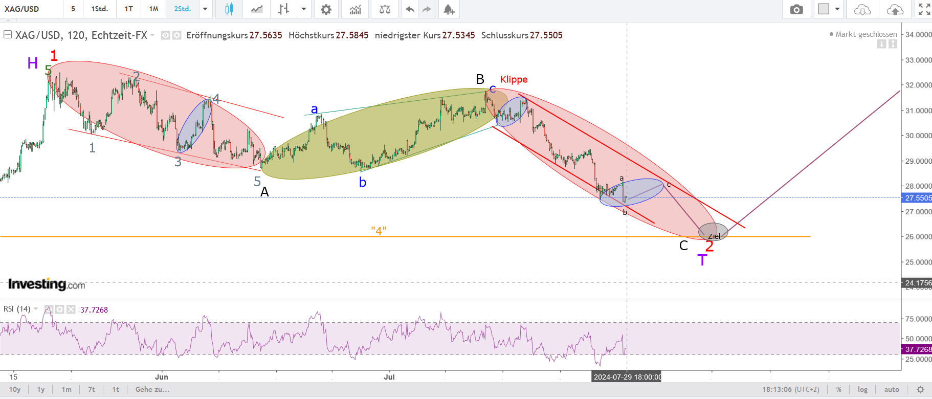 hier bahnt sich ein letzter Abwärtsimpuls (rote 5 ) an, wir stehen jetzt bei der blauen 2..., deshalb