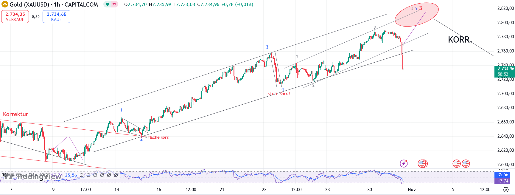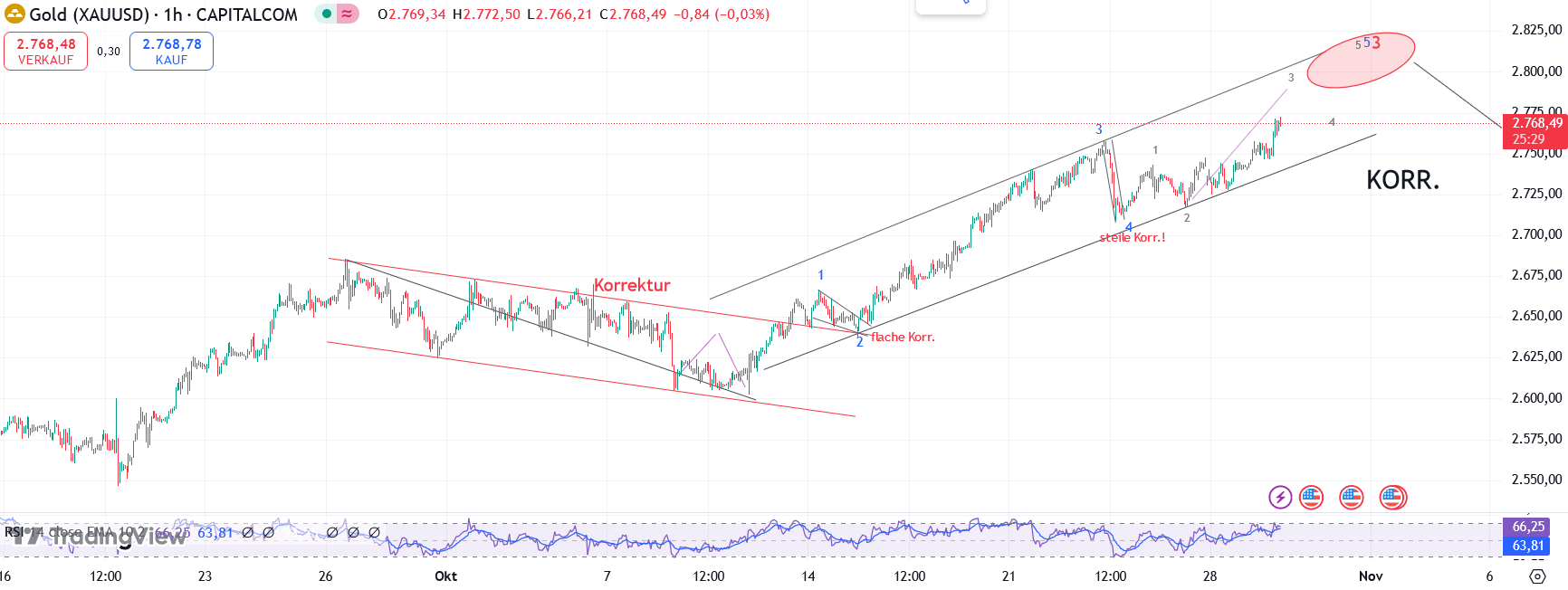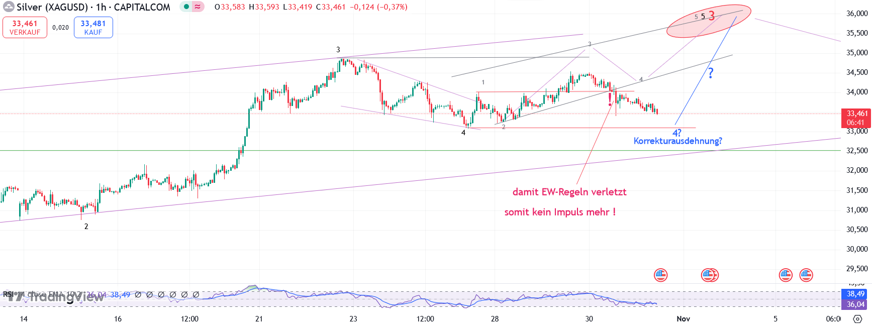 Ich bin weiterhin kurzfristig noch bullish (und langfristig) und erwarte die Vollendung der 3 im Silber noch in der nächsten Woche (US-Wahl), bevor eine Korrektur kommt. Daher halte ich meine Minen ohne Absicherung. Wenn Caldera recht hat, sitze ich die kurzzeitigen Buchverluste bis zum nächsten Aufwärtsimpuls entspannt aus.