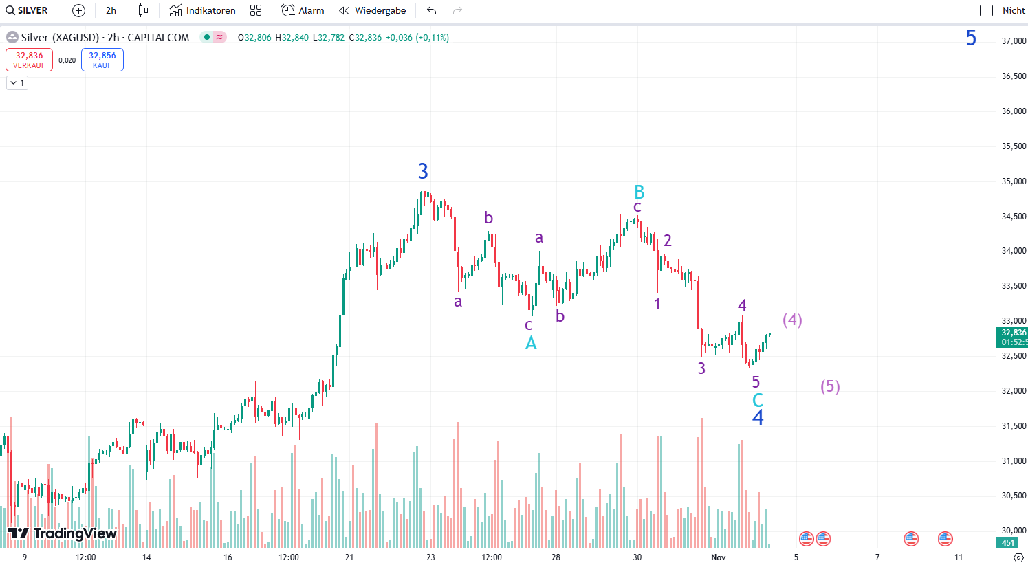 Ich lese hier im Forum auch fast nur noch von einer schon laufenden größeren Korrektur, bin aber selbst nicht der Meinung, dass dies schon ausgemachte Sache ist. Wie sind in meinem Primärszenario kurzfristig nach oben noch nicht fertig. Auch EW-Charts können so angepasst werden, dass keine Regeln verletzt werden. Im Silber hatte ich auch nicht mit so einer tiefen 4 gerechnet, aber die Bewegung sieht für mich eindeutig korrektiv aus und sollte m.E. jetzt zu Ende gehen.
