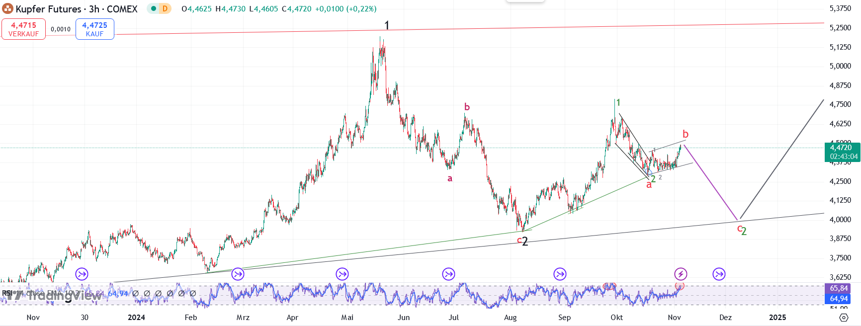 Mit dem Tief vorhin bei 31.44 USD, als klar wurde, dass Trump gewinnt, sollte m.E. ein kurzfristiges Tief eingezogen sein. Ich verfolge aber neben dem oben gezeigten unmittelbar bullishen Szenario (v.a. aus von Caldera dargelegten zyklischen Gründen) zunehmend auch ein Korrekturszenario, bei dem das aktuelle Tief erst die Welle A einer ABC-Korrektur in einer übergeordneten Welle 2 wäre. Diese sollte in den Bereich von etwa 30 USD laufen. Daher beobachte ich jetzt genau, ob der nun erwartete Anstieg impulsiv (spricht für die kommende Welle 5 und ein höheres Hoch) oder korrektiv (spricht für die B der Korrektur) aussieht. Im letzteren Fall würde ich bei etwa 34 USD ggf. nochmal versuchen, etwas mehr Cash zu generieren, um dies bei etwa 30 USD wieder zu investieren.