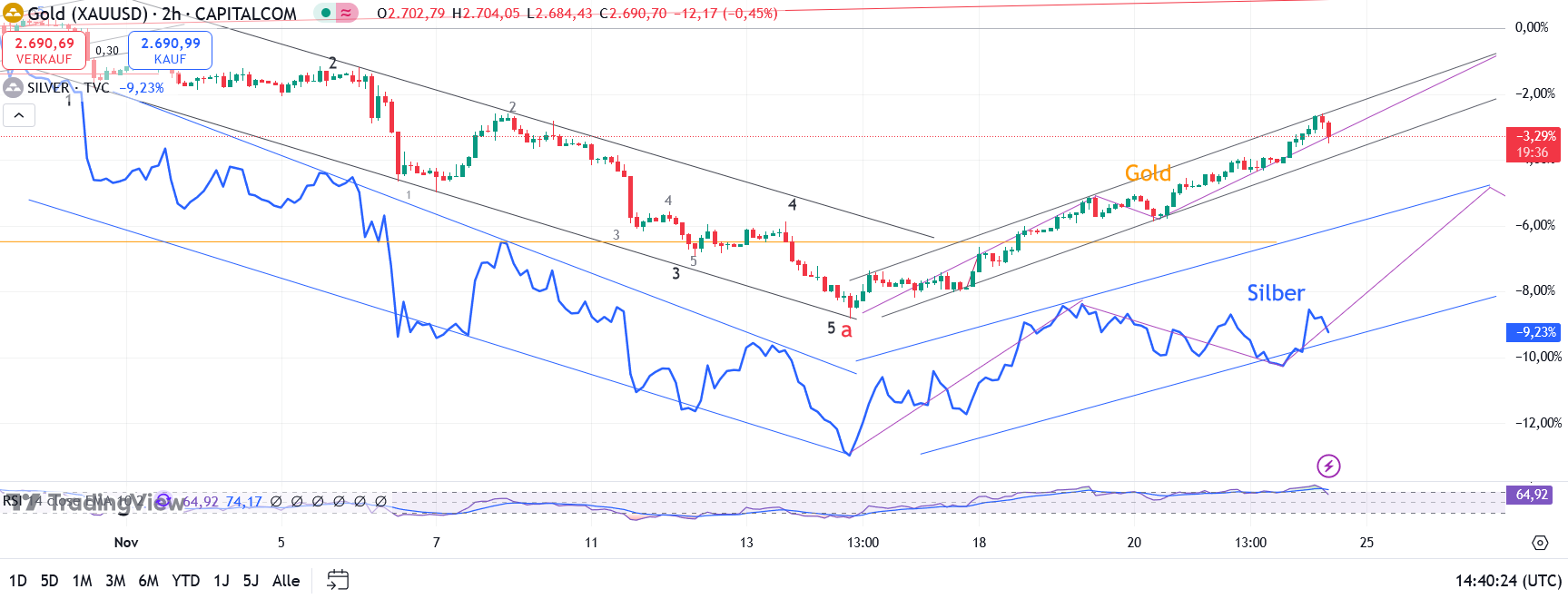 Es handelt sich um die noch ausstehende Welle 5, so wie gestern beim Silber gezeigt, n.m.M.
