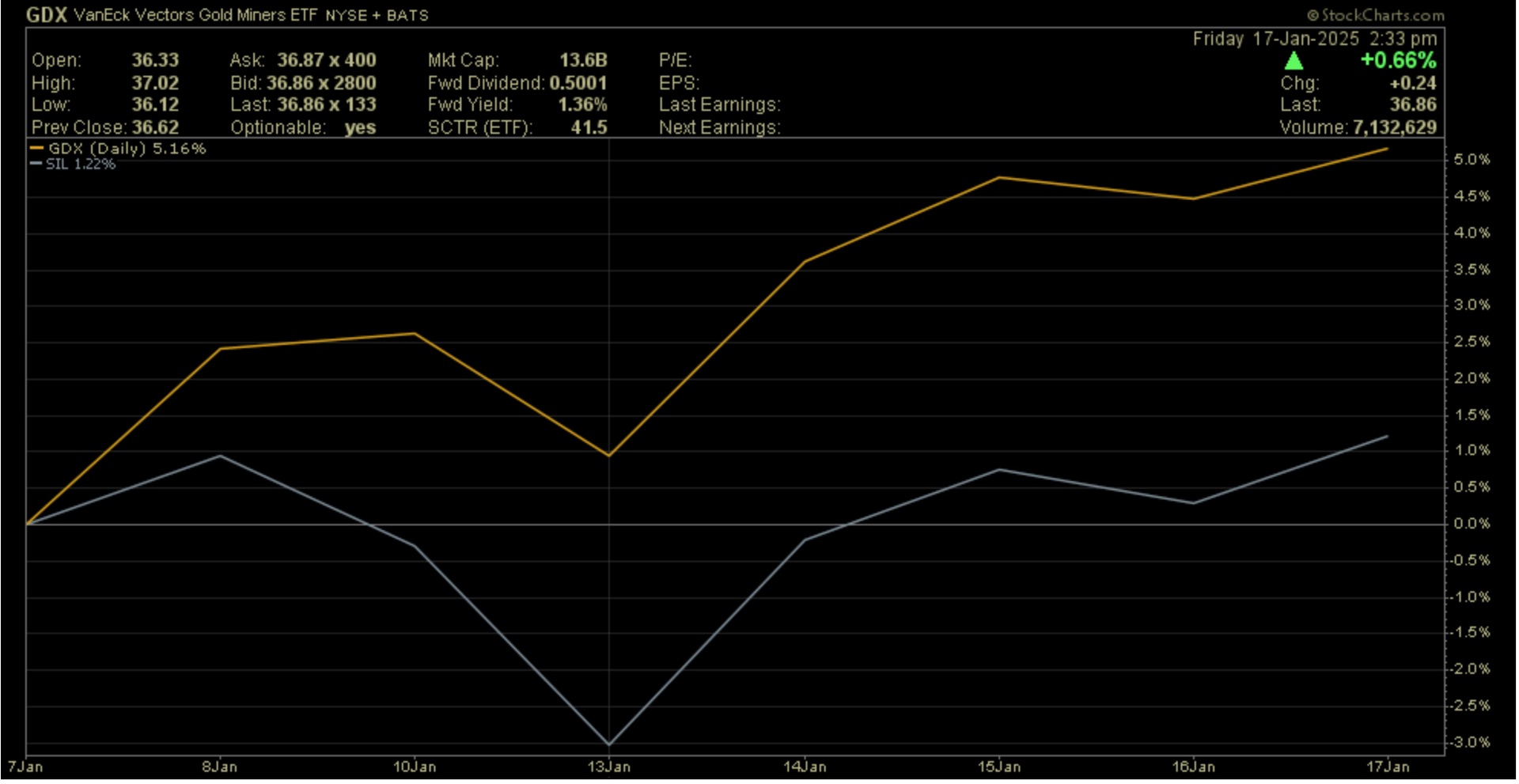 • Sieht so aus, dass die Minen (noch) nicht mitziehen kann ich mir noch erklären, den Silber Kurs absolut nicht. Irgendeine Theorie???