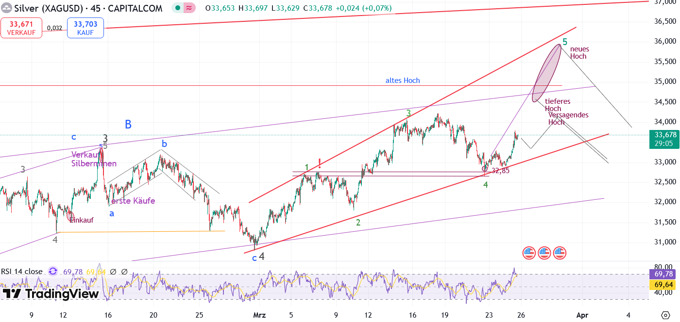 Aus eben demselben Grund eröffnete ich am Freitag auch den Silber-long-Schein bei 32,85 $ (siehe Post vom Freitag) und heute sprang Silber dann deutlich an mit teilw. über +2 % und der Schein war