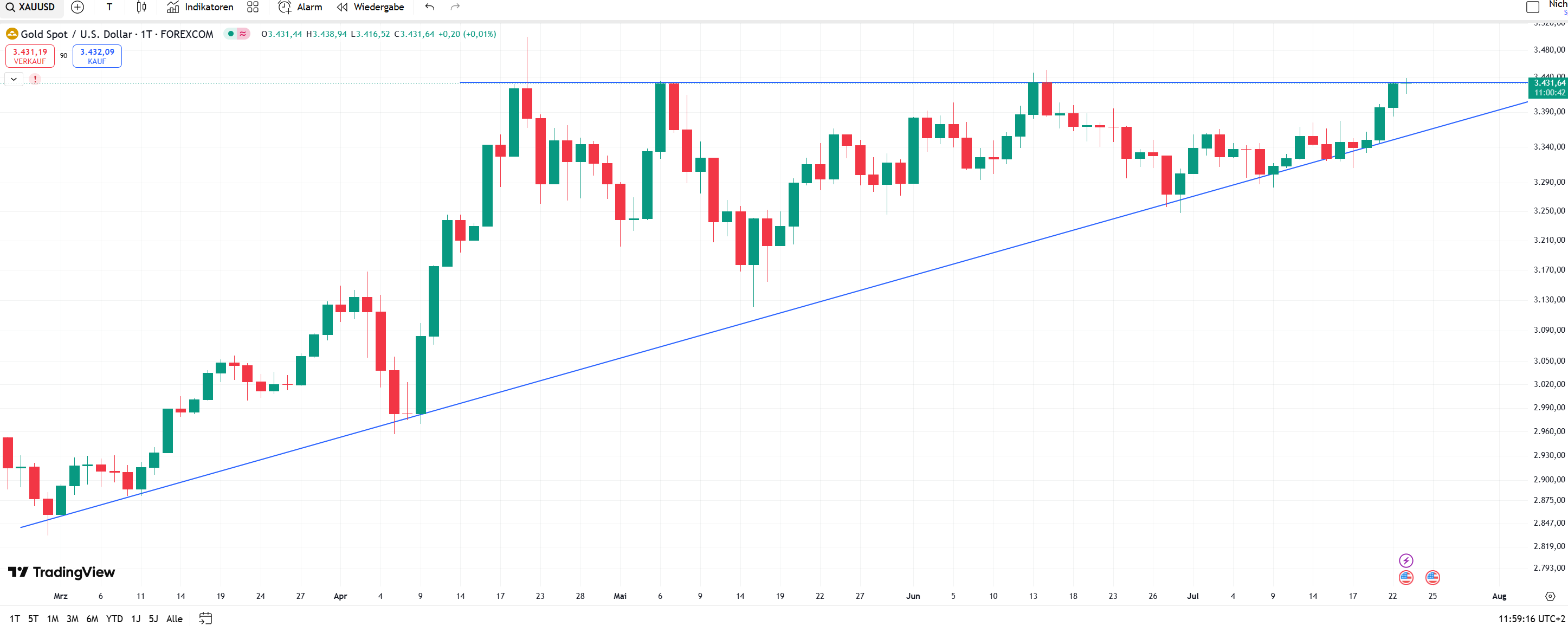 Die Intraday-Bewegung zu den 3428 USD sieht im 1min-Chart wie ein abgeschlossener Impuls aus.
