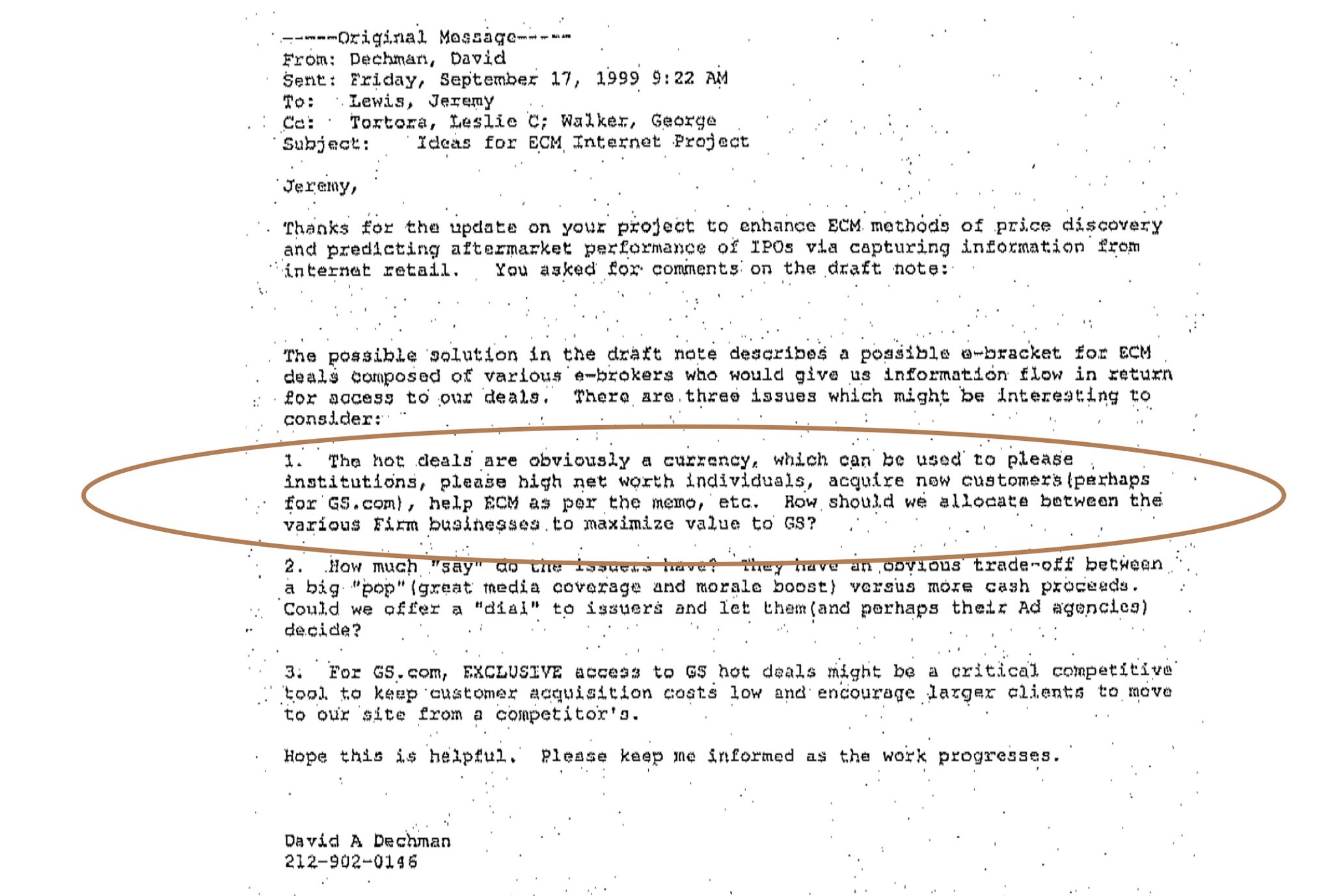 Wer profitiert? Die Großkunden der Investmentbanken (die sich mit der Bezahlung anderer Dienstleistungen revanchieren). Sie haben gestern Abend für 33 Dollar gekauft und können heute für über 90 Dollar verkaufen. Viele werden das tun. Ich liebe diese E-Mail von Goldman Sachs aus dem Jahr 1999, in der sie das klar zum Ausdruck bringen. Das ist alles allgemein bekannt.
