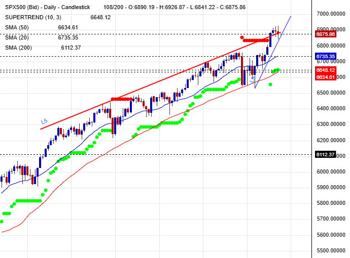 und nun auch im S+P 500 bei 6898. Noch ist der VIX mit 16,9 niedrig.