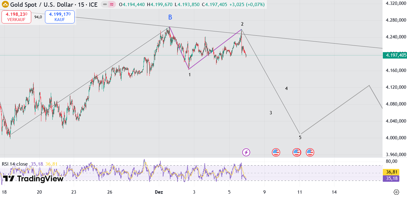 Wir haben alle Long-Positionen nahe dem Höchststand bei 4380 $ geschlossen. Wir waren Ende 2015 in diese Positionen eingestiegen. Es handelt sich nicht um eine Top-Chance. Unsere Gewinne waren so hoch, dass wir sie realisieren mussten… und wir planen, am Ende der „kleinen Welle b“ mit unseren bisher größten Positionen wieder in den Markt einzusteigen!