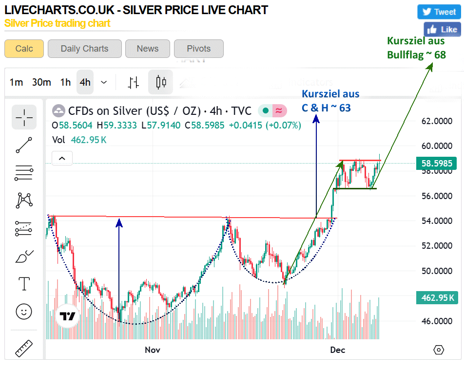 Ich habe überwiegend gestern, am 3.12. den Großteil verkauft, aber nicht die, die noch tief stehen, wie z.B. Coeur Mining. Da stand Silber den ganzen Tag zwischen 58 und 59 $, der bisher beste Verkaufstag, ..