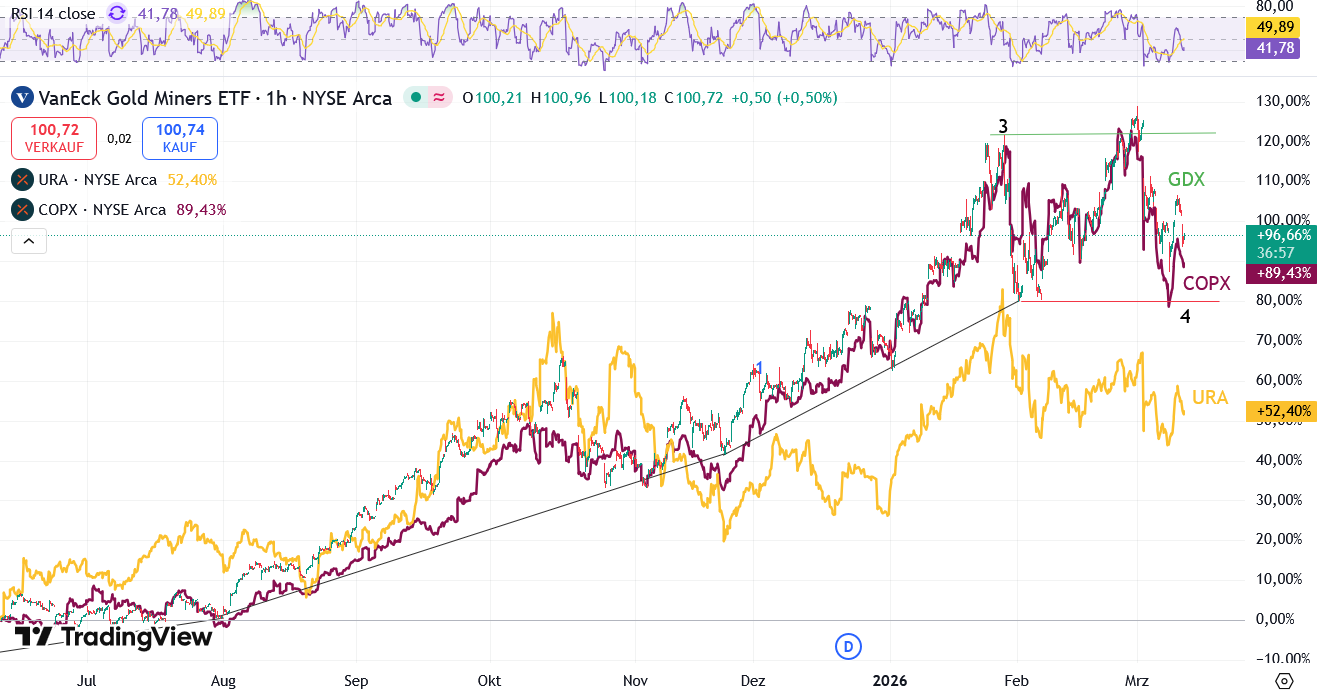 Oder wir korrigieren in einer (abcde) eher seitwärts. Auch dann wären wir in der (c). Die wäre aber eher drei-wellig und würde sich in die blaue abc aufsplitten. Wenn dann a und c gleich lang wären würde der Kurs demnächst drehen-