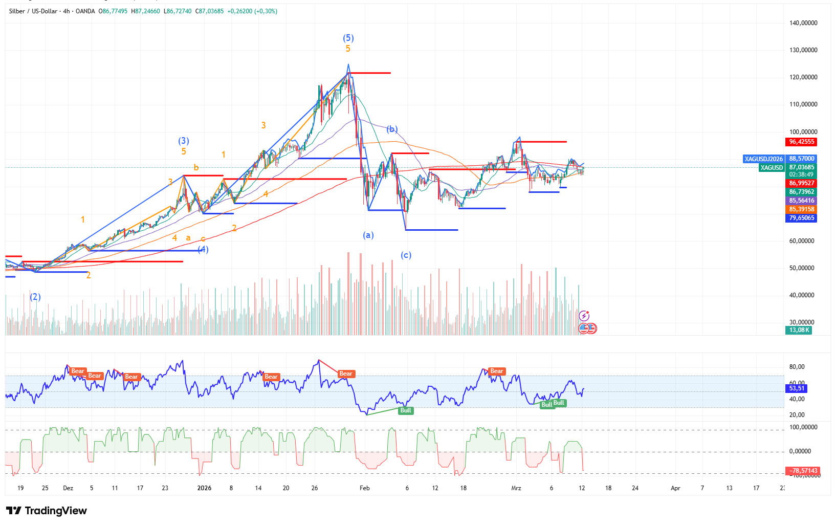 Eigentlich müsste Silber nochmals korrigieren, mindestens runter in den Bereich um $60. Ob es das tut??? Hier mal ein aktueller Vierstundenchart mit Support und Widerständen. Ich bin mir unsicher, was ich mit meinem Short tun soll, den ich bei $89,50 aufgemacht habe. Er läuft nun seit Dienstagabend. Seither laufen wir im Vierstundenchart seitwärts. Heute und morgen gibt es aber nochmals News bei den Amis, die den Markt bewegen könnten.