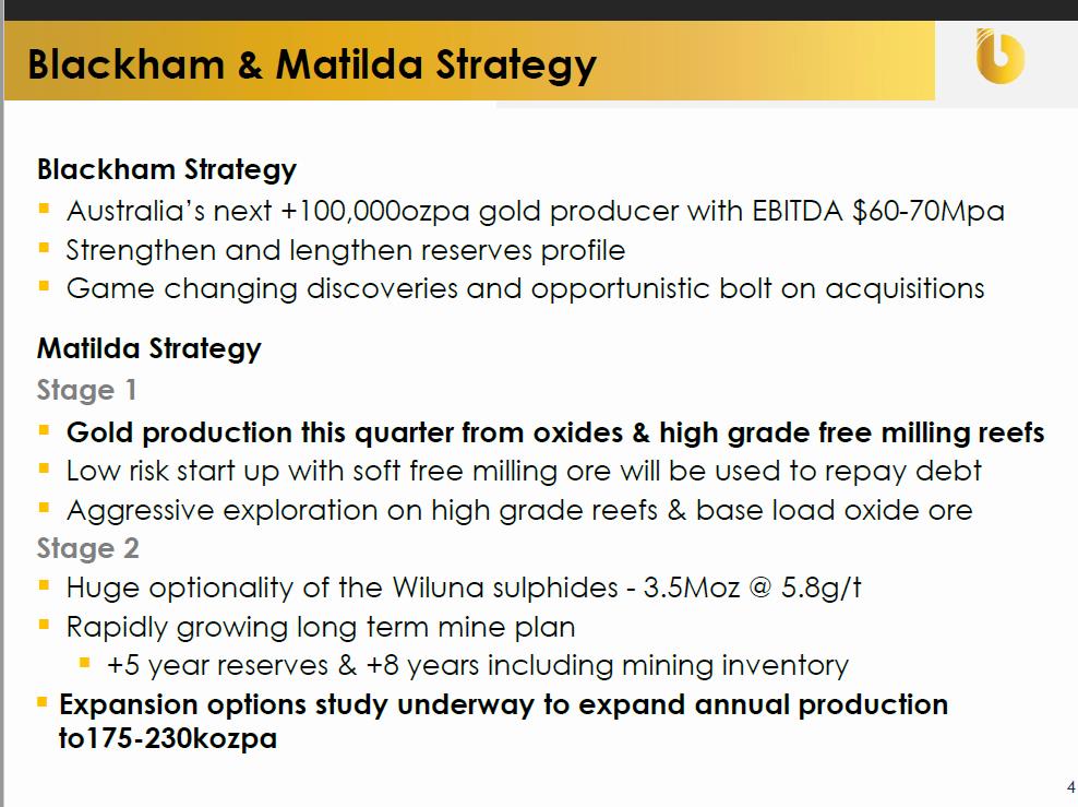 Das Gold kann nicht weglaufen, und die Bewertung von Blackham mit einer Marktkapitalisierung von ca. 73 Mio. Euro/82 Mio US $, bei 6,4 Mio oz in allen Kategorien ergibt eine Bewertung von unter 13 US$/oz Gold.